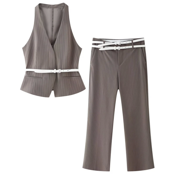 Ensemble Chic Rayé avec Ceinture — Gilet Sans Manches et Pantalon Taille Haute