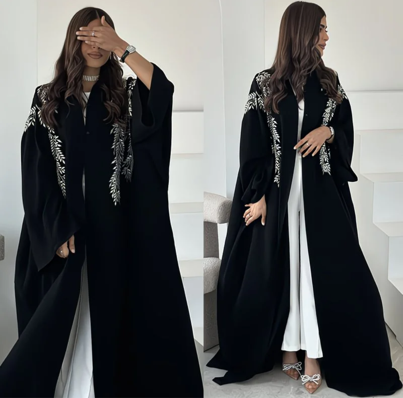 Confectionnée dans un tissu fluide et noble, cette abaya noire est ornée de broderies argentées délicates, évoquant des feuilles élégantes qui subliment la silhouette avec grâce.