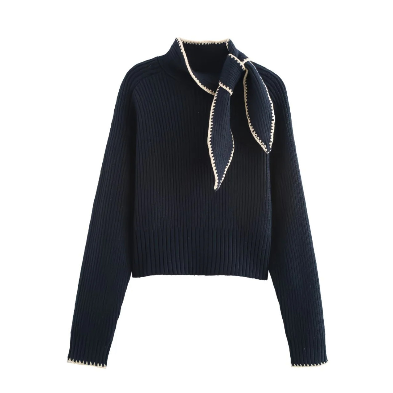 Ce pull bleu marine incarne l’élégance décontractée à la française. Son col foulard intégré avec bordures contrastées apporte une touche sophistiquée et féminine à une coupe simple et moderne. Confectionné dans une maille douce et confortable, il est parfait pour la mi-saison ou les journées fraîches.