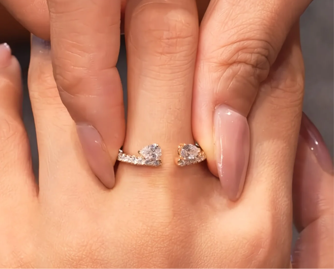 Son design ouvert met en valeur deux pierres taille poire scintillantes, serties sur un anneau délicatement pavé de zircons.