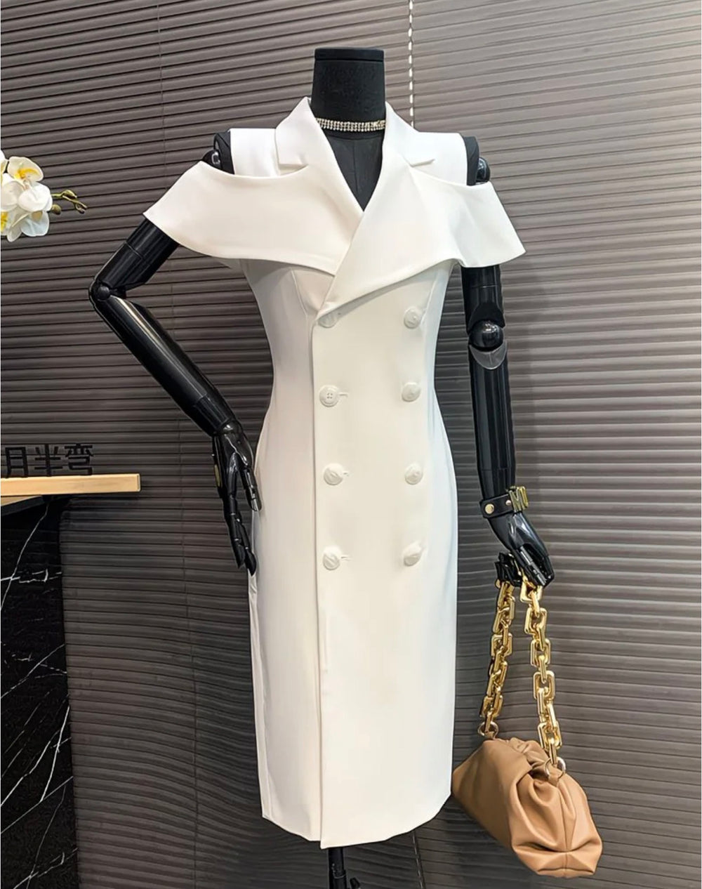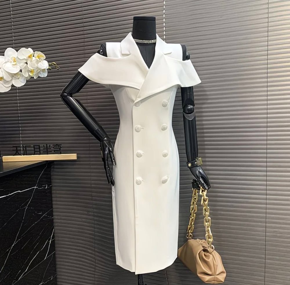 Robe blazer blanche avec col structuré et boutons, pour une allure chic et sophistiquée.