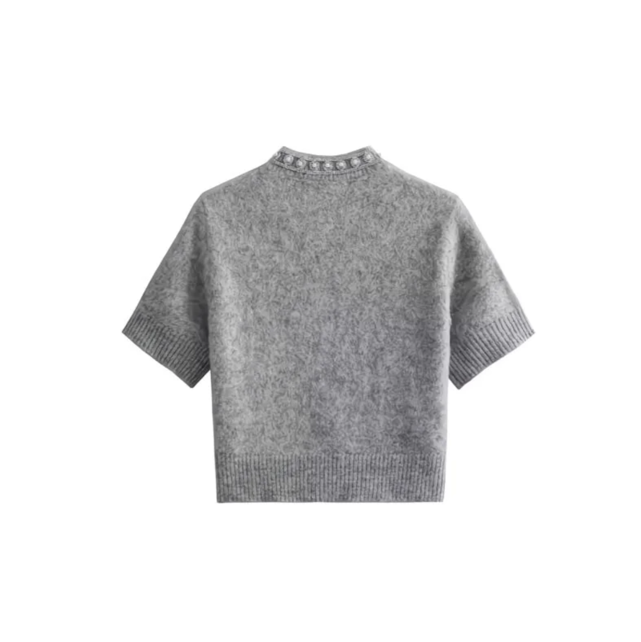 Gilet Court en Maille Douce à Manches Courtes – Détail Perles Élégantes